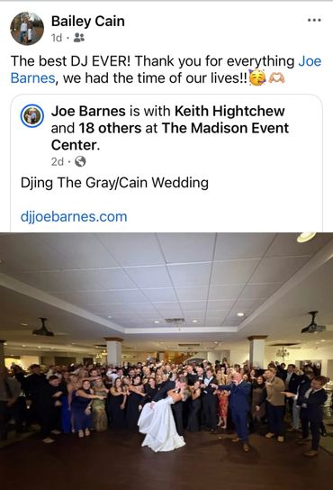You only get one chance to celebrate your wedding the right way. Finding the right DJ to entertain your guest during the reception is one of the most important decisions you will make. Your DJ can make or break your wedding experience. I create a high energy party atmosphere that you and your guest will never forget. When the music matters call DJ Joe Barnes.